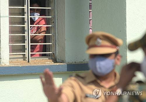 epa08928159 An Indian man peers from a window as policemen stand guard outside the Bhandara District General Hospital in the aftermath of a fire, in Bhandara, Maharashtra, India, 09 January 2021. At least 10 newborn babies died after a fire broke out at the hospital's child care unit. Further investigations are underway. EPA/STR