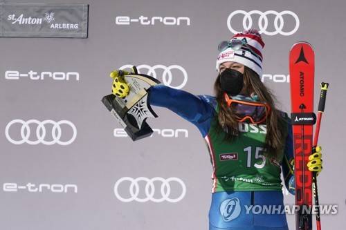 Third placed United States' Breezy Johnson celebrates at the end of an alpine ski, women's World Cup downhill in St. Anton, Austria, Saturday, Jan. 9, 2021. (AP Photo/Giovanni Auletta)
