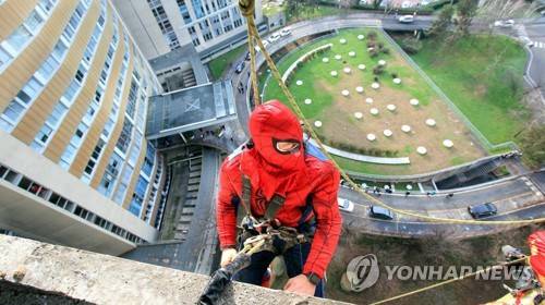 epa08928181 An acrobat dressed as Marvel's Spider-Man rappels down the roof to greet the children of the pediatrics ward and the Covid-19 patients of the San Paolo Hospital, in Milan, Italy, 09 January 2021. EPA/Paolo Salmoirago