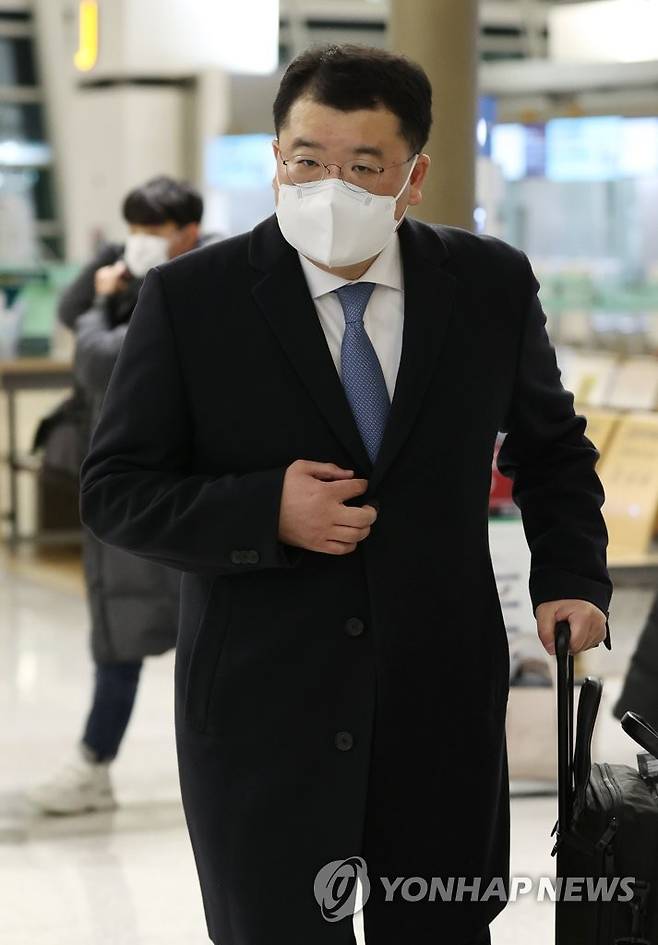 (영종도=연합뉴스) 홍해인 기자 = 최종건 외교부 1차관이 9일 오후 인천국제공항 제1여객터미널 출국장에서 이란으로 출국하고 있다. 최 차관은 카타르 도하를 경유해 이란 테헤란에 도착한 뒤 억류된 우리나라 국적 화학 운반선 '한국케미호'와 선원의 석방 교섭에 나선다. 2021.1.9