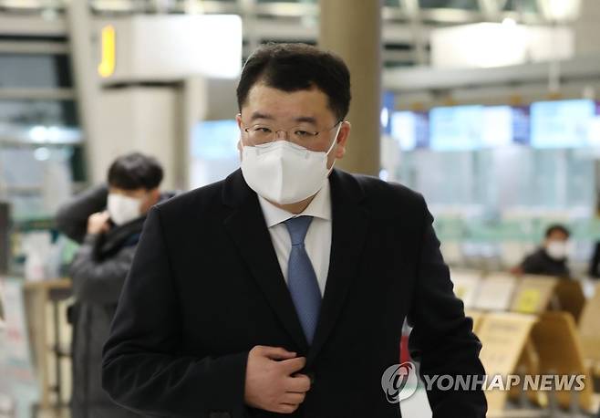 (영종도=연합뉴스) 홍해인 기자 = 최종건 외교부 1차관이 9일 오후 인천국제공항 제1여객터미널 출국장에서 이란으로 출국하고 있다. 최 차관은 카타르 도하를 경유해 이란 테헤란에 도착한 뒤 억류된 우리나라 국적 화학 운반선 '한국케미호'와 선원의 석방 교섭에 나선다. 2021.1.9
