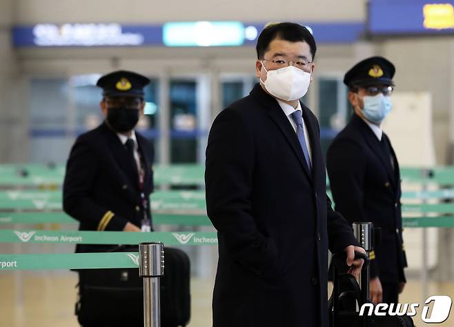 (인천공항=뉴스1) 오대일 기자 = 최종건 외교부 1차관이 9일 밤 인천국제공항에서 이란에 억류 중인 한국 선박과 선원의 조기 석방을 논의하기 위해 이란으로 출국하고 있다. 최 차관은 화학운반선 '한국케미호'과 우리 국민 5명을 포함한 선원 20명의 억류 해제 문제를 놓고 이란 당국과 교섭에 들어갈 계획이다. 2021.1.9/뉴스1