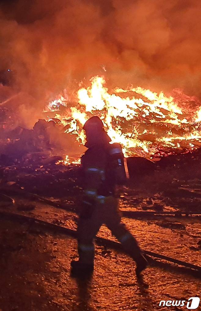 (포항=뉴스1) 최창호 기자 = 9일 오후 8시쯤 경북 포항시 남구 호동 쓰레기매립장에서 불이 나 소방당국이 진화 작업을 벌이고 있다.