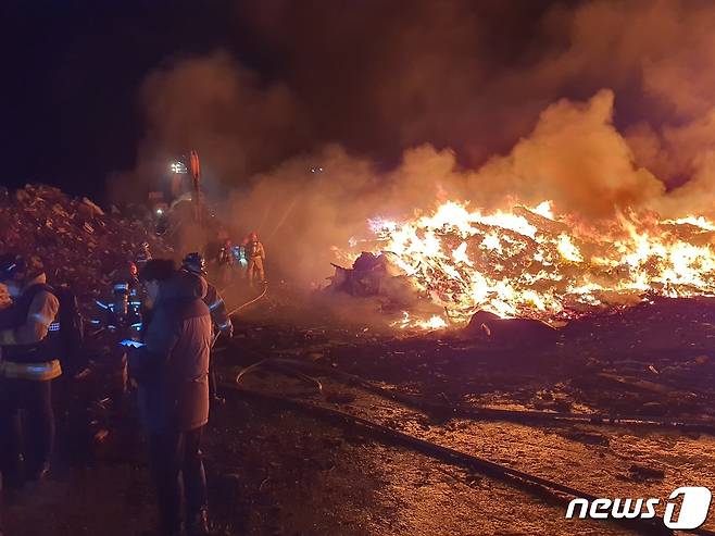 (포항=뉴스1) 최창호 기자 = 9일 오후 8시쯤 경북 포항시 남구 호동 쓰레기매립장에서 불이 나 소방당국이 진화 작업을 벌이고 있다.