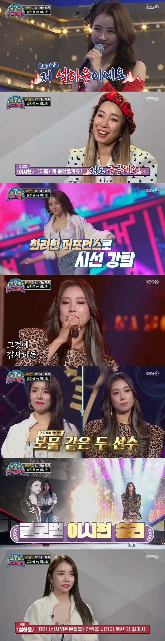 설하윤은 한혜진의 ‘너는 내 남자’를 선곡했다. 설하윤은 시작부터 노래가 끝날 때까지 쉬지 않고 파워풀한 퍼포먼스를 펼치면서도 흔들리지 않는 음정으로 박수를 받았다.