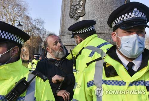 Police officers, wearing face masks to protect against coronavirus, detain a man attending an anti-lockdown demonstration in Clapham Common,south west London, Saturday, Jan. 9, 2021, during England's third national lockdown to curb the spread of coronavirus. (AP Photo/Alberto Pezzali)