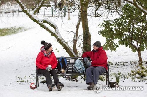 epa08928264 Two women enjoying a picnic and conversation in the snow in Carmunock near, Glasgow, Britain, 09 January 2021. EPA/Robert Perry