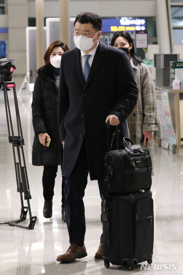 [인천공항=뉴시스]박진희 기자 = 최종건 외교부 제1차관이 9일 오후 이란에 나포·억류된 한국 국적 선박과 선원의 조기 석방을 위해 인천국제공항을 통해 출국하고 있다. 최 차관은 내일(10일) 0시35분 인천국제공항에서 출발하는 항공편으로 카타르 도하를 경유해 이란(테헤란)으로 갈 예정이다. 2021.01.09. pak7130@newsis.com