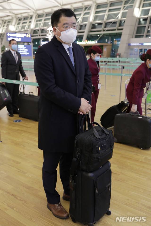 [인천공항=뉴시스]박진희 기자 = 최종건 외교부 제1차관이 9일 오후 이란에 나포·억류된 한국 국적 선박과 선원의 조기 석방을 위해 인천국제공항을 통해 출국하고 있다. 최 차관은 내일(10일) 0시35분 인천국제공항에서 출발하는 항공편으로 카타르 도하를 경유해 이란(테헤란)으로 갈 예정이다. 2021.01.09. pak7130@newsis.com