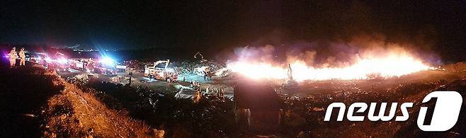 (포항=뉴스1) 최창호 기자 = 9일 오후 8시쯤 경북 포항시 남구 호동 쓰레기매립장에서 불이 나 소방당국이 진화 작업을 벌이고 있다.