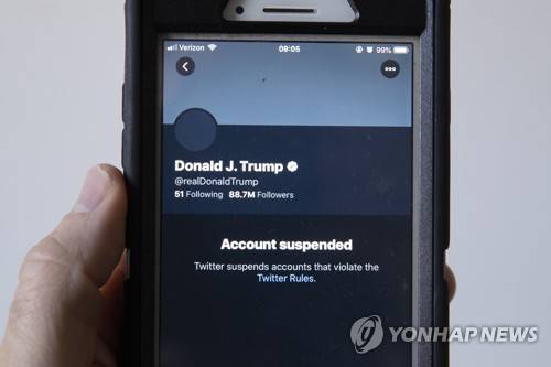 epa08928326 A mobile phone displays the suspended status of the Twitter account of US President Donald J. Trump, in Washington, DC, USA, 09 January 2021. Twitter made the decision to ban the account after Trump incited a mob of his supporters to riot on the US Capitol in an attempt to stop Congress from counting the electoral college votes, causing chaos and several fatalities. Twitter issued a statement saying the company 'permanently suspended the account due to the risk of further incitement of violence'. EPA/MICHAEL REYNOLDS