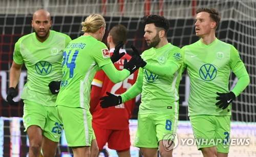 epa08928384 Wolfburg's Renato Steffen (2-R) celebrates his 0-1 goal during the German Bundesliga soccer match between 1. FC Union Berlin and VfL Wolfsburg in Berlin, Germany, 09 January 2021. EPA/FILIP SINGER / POOL CONDITIONS - ATTENTION: The DFL regulations prohibit any use of photographs as image sequences and/or quasi-video.