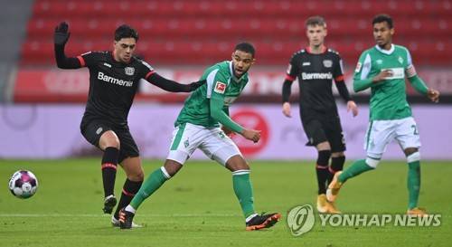 epa08928387 Leverkusen's Nadiem Amiri (L) in action against Bremen?s Jean-Manuel Mbom (2-L) during the German Bundesliga soccer match between Bayer 04 Leverkusen and SV Werder Bremen in Leverkusen, Germany, 09 January 2021. EPA/SASCHA STEINBACH / POOL CONDITIONS - ATTENTION: The DFL regulations prohibit any use of photographs as image sequences and/or quasi-video.