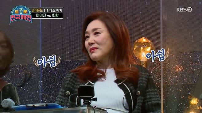 본격 무대에 앞서 마이진은 상대인 '최향' 2행시로 기선 제압에 들어갔다.