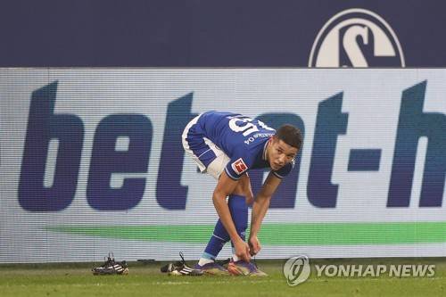 epa08928409 Amine Harit of FC Schalke 04 changes his boots during the Bundesliga match between FC Schalke 04 and TSG Hoffenheim at Veltins-Arena in Gelsenkirchen, Germany, 09 January 2021. EPA/LARS BARON / POOL DFL regulations prohibit any use of photographs as image sequences and/or quasi-video.