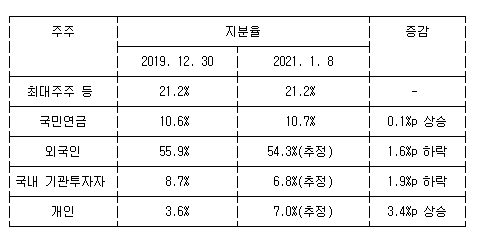 다만, 2019년 말 주주명부를 기준으로 파악된 외국인 지분율(55.9%)은 금융당국에서 집계하는 지분율(56.8%)과는 다소(0.9%가량) 차이가 나서 지난 8일 기준 지분율도 실제 차이가 날 수는 있다.