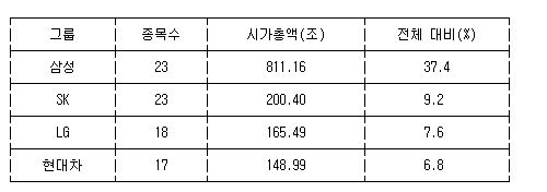 유가증권시장 전체 시총에서 차지하는 비중은 삼성과 SK가 각각 37.4%와 9.2%, LG와 현대차는 각각 7.6%와 6.8%였다. 4대 그룹 전체의 비중은 61.0%로 집계됐다.