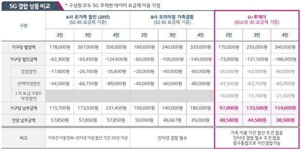 5G•LTE 무제한 요금제로 결합 가능하며 최대 5명까지 가능하다. 할인액은 2인 결합 시 각 1만원, 3인 각 1만4천원, 4인~5인은 각 2만원이 할인된다.