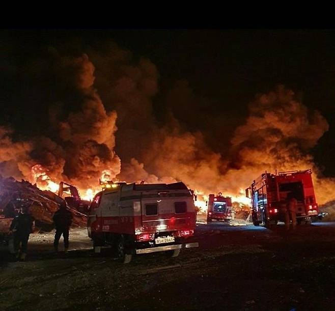 (서울=연합뉴스) 9일 밤 경북 포항시 남구 쓰레기매립장에서 불이 나 소방당국이 진화하고 있다. 2021.1.10