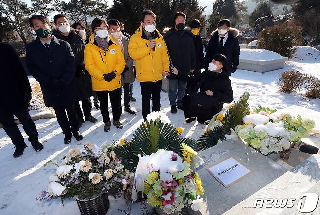 (남양주=뉴스1) 박세연 기자 = 김종철 정의당 대표가 10일 오전 경기도 남양주 모란공원묘지 고 노회찬 전 의원 묘소에서 참배 후 발언을 하고 있다. 2021.1.10/뉴스1