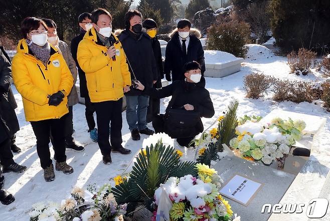 (남양주=뉴스1) 박세연 기자 = 김종철 정의당 대표가 10일 오전 경기도 남양주 모란공원묘지 고 노회찬 전 의원 묘소에서 참배 후 발언을 하고 있다. 2021.1.10/뉴스1