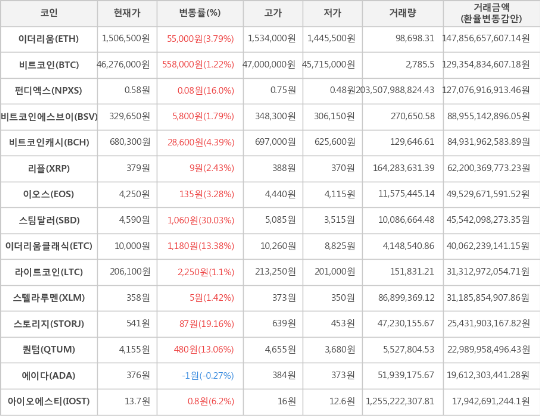 또한, 스토리지(19.16%, 541원), 펀디엑스(16.0%, 0.58원), 이더리움클래식(13.38%, 10,000원), 퀀텀(13.06%, 4,155원), 아이오에스티(6.2%, 13.7원), 비트코인캐시(4.39%, 680,300원), 이더리움(3.79%, 1,506,500원), 이오스(3.28%, 4,250원), 리플(2.43%, 379원), 비트코인에스브이(1.79%, 329,650원), 스텔라루멘(1.42%, 358원), 라이트코인(1.1%, 206,100원)이 상승세를 나타냈다.