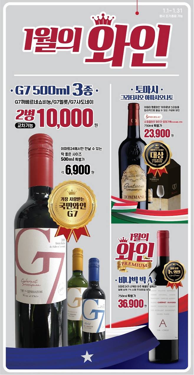 1월 한달간 G7(500ml) 3종(까베르네쇼비뇽/멜롯/샤도네이) 중 2병 구매 시 1만원에 제공한다. 고객들은 인기 와인 1L를 1만원에 구매할 수 있는 기회인 셈이다. 특히 500ml G7은 지난해 이마트24가 용량 차별화 상품으로 선보인 단독 판매 와인이다.