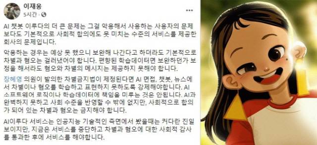 이 전 대표는 "이루다는 AI 기술적 측면에서 봤을 때는 커다란 진일보이지만, 지금은 서비스를 중단하고 차별·혐오에 대한 사회적 감사를 통과한 후에 서비스해야 한다"고 조언했다.