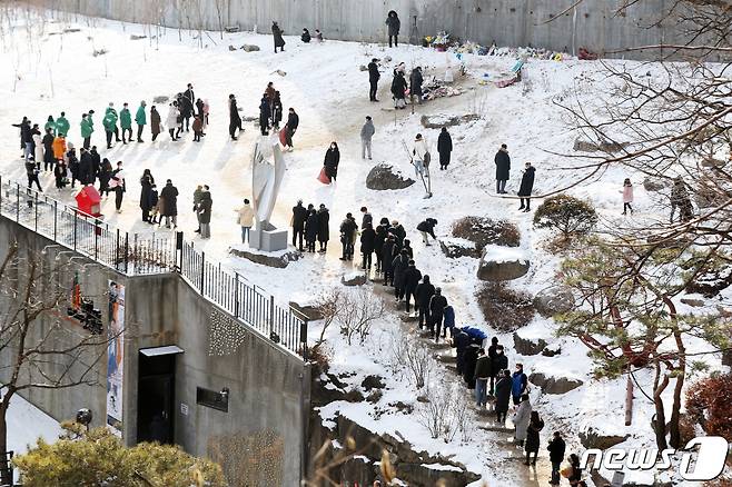 (양평=뉴스1) 황기선 기자 = 10일 오후 경기 양평 하이패밀리 안데르센 공원묘원에서 시민들이 양부모의 학대로 숨진 16개월 영아 정인(가명)양을 추모하기 위해 줄을 서 있다. 2021.1.10/뉴스1
