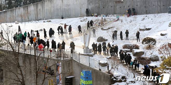 (양평=뉴스1) 황기선 기자 = 10일 오후 경기 양평 하이패밀리 안데르센 공원묘원에서 시민들이 양부모의 학대로 숨진 16개월 영아 정인(가명)양을 추모하기 위해 줄을 서 있다. 2021.1.10/뉴스1