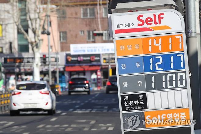 (서울=연합뉴스) 강민지 기자 = 전국 주유소 휘발유 가격이 7주 연속 상승세 오른 10일 서울의 한 주유소 앞에 가격 정보가 게시되어 있다.