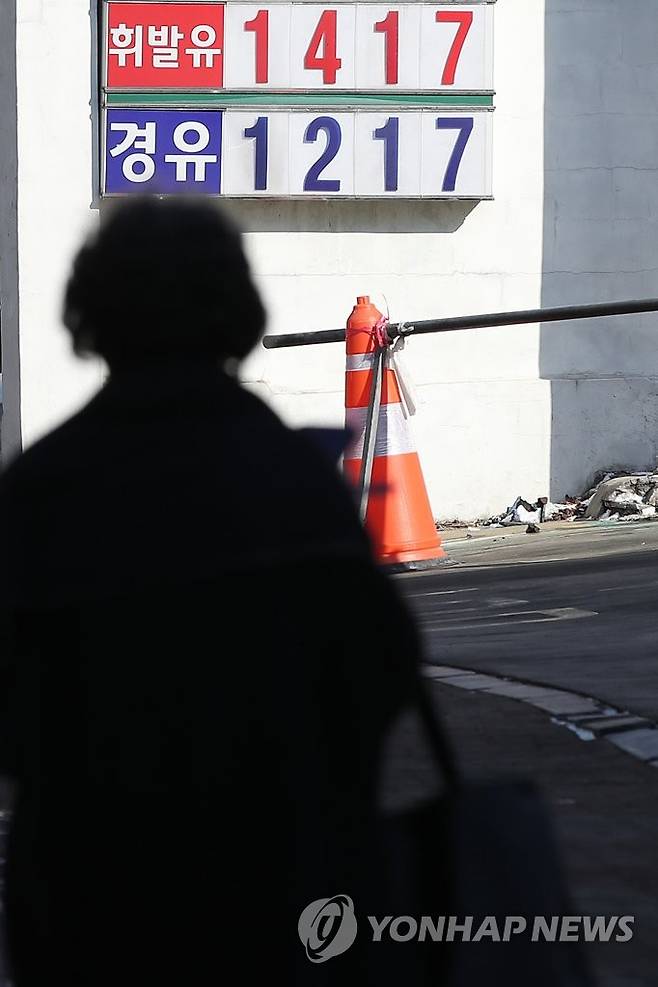 (서울=연합뉴스) 강민지 기자 = 10일 서울의 한 주유소 앞에 가격 정보가 게시되어 있다. 오피넷에 따르면 1월 첫째 주 전국 주유소 휘발유 평균 가격은 전주보다 16.7원 오른 ℓ당 1,430.1원, 서울은 ℓ당 1,504.9원을 기록했다. 2021.1.10
