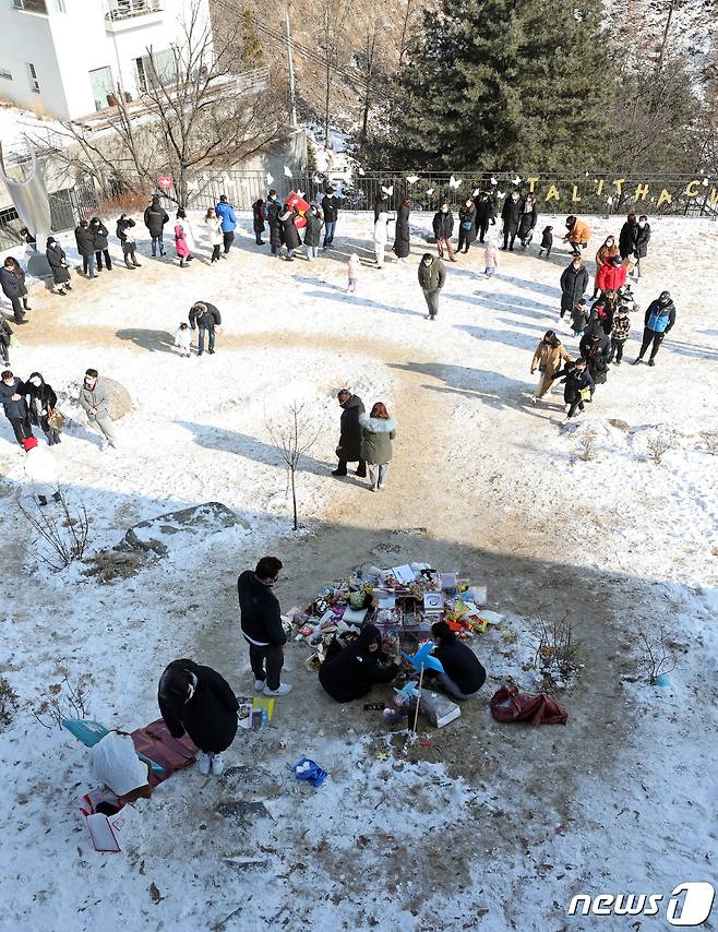 (양평=뉴스1) 황기선 기자 = 10일 오후 경기 양평 하이패밀리 안데르센 공원묘원에서 시민들이 양부모의 학대로 숨진 16개월 영아 정인(가명)양을 추모하기 위해 줄을 서 있다. 2021.1.10/뉴스1