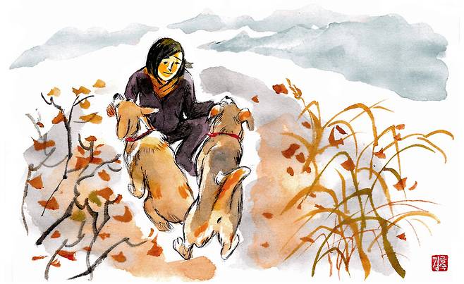 겨울을 좋아한다. 추울수록 좋다. 하늘이 파랗고 공기는 맑다. 하얀 눈이 올 때는 아이가 된다. 3월부터 11월까지 진드기 때문에 강아지들을 데리고 산에 갈 수가 없었다. 진드기 방지 목걸이를 해주고 약을 발라도 붙었다. 진드기는 집안에서도 발견되었다. 산책은 논두렁으로 다녀야 했다. 날이 추워지고 산으로 갈 수 있게 되었다. 오후 3시, 감자가 낑낑대며 나가자고 보챈다. 물병에 물을 채우고 잠바를 입는 동안 감자와 당근이는 흥분해서 뛰어다닌다. 감자가 먼저 당근이 귀에 소리를 ‘꽥’ 지른다. 때로는 당근이의 뒷다리를 물며 시작한다. 당근이도 감자의 귀를 문다. 당근이가 도망을 가고 감자가 쫓는다. 감자가 도망을 가고 당근이가 쫓기도 한다.