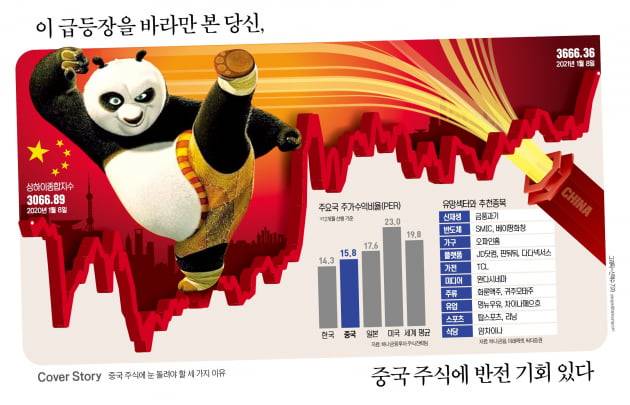 전문가들이 2021년 중국에 관심을 가져야 한다는 가장 큰 이유는 내수 시장의 확대다. 중국은 세계 최대 내수 시장을 갖고 있다. 코로나19 충격에서 벗어나 내수가 빠르게 회복되고 있다. 또 첨단산업은 급성장 중이다. 세계에서 2019년 신규 등록된 유니콘 기업의 41.7%(206개사)가 중국일 정도다. 주가는 크게 오르지 않았다. 상하이종합지수의 12개월 선행 주가수익비율(PER)은 15.8배 수준이다. 미국(23배)의 3분의 2 수준이다. 홍콩증시 PER도 17.3배로, 세계 평균(19.8배)을 밑돌고 있다.