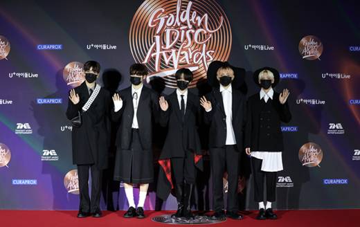 [마이데일리 = 유진형 기자] 투바투가 10일 오후 경기도 고양시 킨텍스에서 온라인으로 진행된 '제35회 2021 골든디스크 어워즈 with 큐라프록스’ 음반 부문 시상식 포토월에서 인사하고 있다.