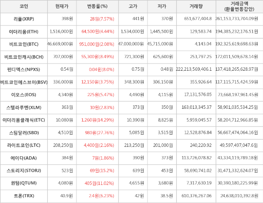 가상화폐 시세 (제공: 암호화폐 거래소 업비트)현재 암호화폐 거래소 "업비트"에 따르면 가상화폐 대장 격인 비트코인의 시세는 전일 대비 951,000원(2.08%) 상승한 46,669,000원에 거래되고 있다.
