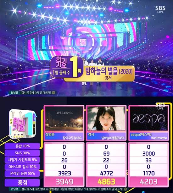 10일 방송된 SBS '인기가요' 1월 둘째 주는 장범준 '잠이 오질 않네요' 경서 '밤하늘의 별을(2020)', 에스파 'Black Mamba'가 1위 후보에 오른 가운데 경서의 '밤하늘의 별을'이 1위를 차지했다.