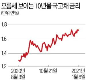 10년짜리 국채 금리가 이처럼 빠르게 오르는 것은 올해 경제 성장률이 3%(한은 전망치)에 이르는 등 실물경제가 회복될 것이라는 기대에서다. 국채 발행 물량이 증가하는 것도 금리를 밀어올리고 있다. 정부는 올해 국채 176조5000억원어치를 발행할 계획을 세웠다. 작년보다 1조9000억원가량 늘어나는 데 불과하지만 2016~2019년 연평균 발행 규모인 100조원을 훌쩍 넘어서는 규모다.