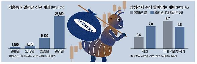 개인들이 '한국 대장주' 삼성전자 주식을 쓸어담고 있다. 금융투자업계에 따르면 지난해 1월부터 이달 8일까지 개인이 순매수한 삼성전자 주식은 2억206만4917주였다. 2019년 말 삼성전자의 개인 주주 지분율은 3.6%였다. 이게 1년여 만에 7%(추정)로 부쩍 올라선 것이다. 개인은 올해 들어서만 삼성전자를 2조539억원 순매수했다.