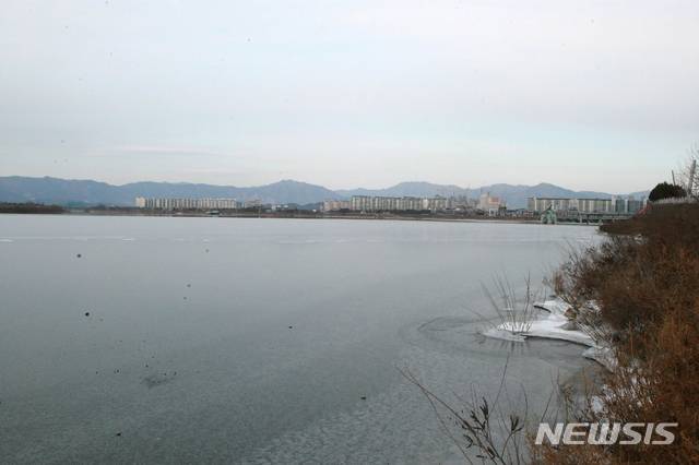 [춘천=뉴시스]장경일 기자 = 강원 영서와 산간에 한파특보가 발효 중인 10일 오후 춘천시 소양강이 한파로 꽁꽁 얼어붙어 있다. 2021.01.10. jgi1988@newsis.com