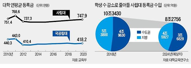 대학교육연구소가 지난해 7월 발표한 보고서에 따르면 전체 지방대학 중 85곳(34.1%)은 2024년 신입생 충원율이 70% 아래로 떨어질 것으로 예상됐다. 수도권 대학도 5.6%는 충원율이 70%에 못 미칠 것으로 전망됐다. 대학교육연구소는 학생 수가 감소함에 따라 대학들의 재정 악화가 심해질 것이라고 진단했다. 특히 지방대학들의 등록금 수입이 2024년에는 약 3조6829억원으로, 2018년(4조9630억원) 대비 약 25% 줄어들 것으로 예상했다. 수도권 대학들의 수입도 2018년 5조3800억원에서 2024년 4조5927억원으로 14.6%가량 감소할 것으로 봤다.