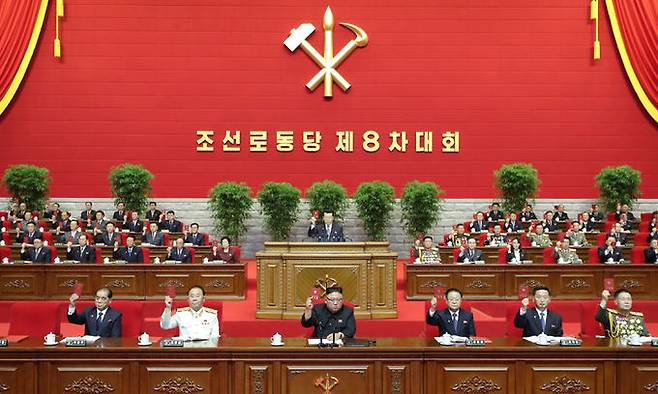 | 대표증 들어보이는 김정은 북한 노동당 제8차 대회 닷새째 일정에 참석한 김정은 국무위원장(가운데) 등이 9일 토론에서 당 대표증을 들어 의결하고 있다. 왼쪽부터 당대회 주석단에 앉아있는 박봉주 당 부위원장과 리병철 당 중앙군사위원회 부위원장, 김 위원장, 최룡해 국무위원회 제1부위원장, 김덕훈 내각 총리, 박정천 군 총참모장. 평양=노동신문·뉴스1 |