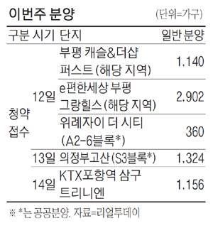 한편 부동산정보업체 리얼투데이에 따르면 1월 둘째 주에는 전국 15곳에서 총 1만578가구(오피스텔·임대 포함, 도시형생활주택·행복주택 제외) 청약 접수가 이뤄진다. 서울 내 분양하는 단지는 없다.