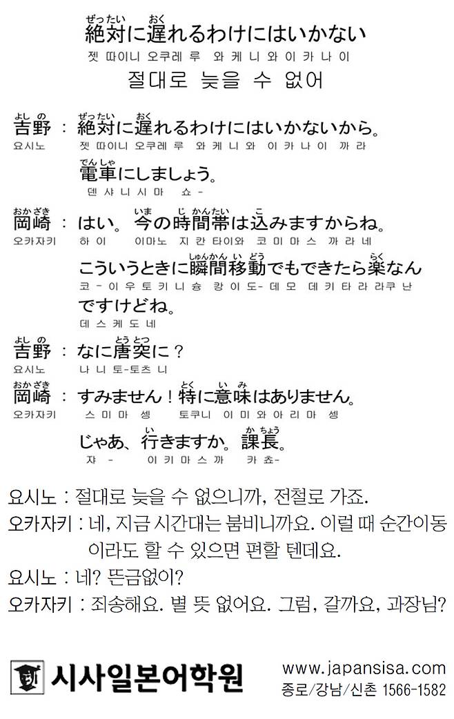 [시사일본어학원의 초단기 일본어 회화] 절대로 늦을 수 없어