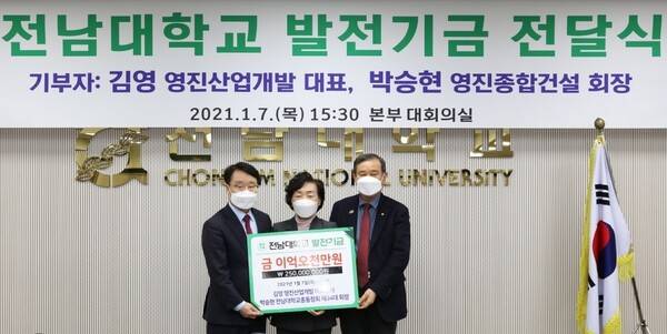 전남대 공대 ‘70학번 캠퍼스 커플’ 동문인 박승현(왼쪽) 영진종합건설 회장과 김영(가운데) 영진산업 대표 부부는 10일 모교인 전남대(총장 정병석·오른쪽)에 발전기금 2억5000만원을 기탁했다. 이로써 부부는 목표액 10억원을 채웠다. 전남대 제공
