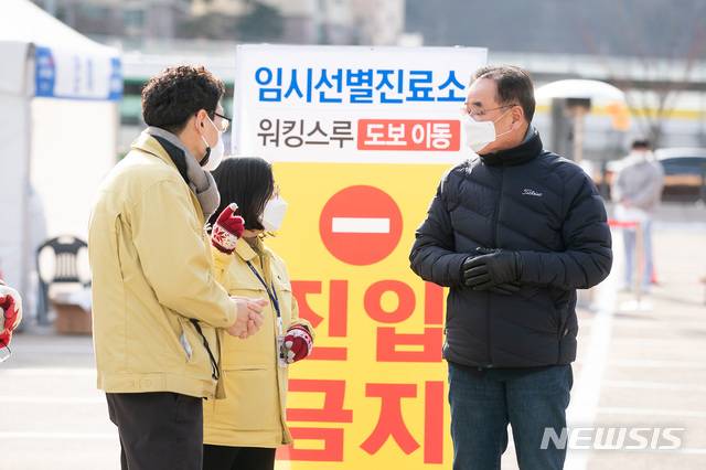 [구미=뉴시스] 박홍식 기자 = 장세용 경북 구미시장이 10일 오후 금오산 사거리 복개주차장에 마련된 임시선별진료소를 찾아 한파속에 비상 근무중인 근무자들을 격려하고 있다. (사진=구미시 제공) 2021.01.10 photo@newsis.com