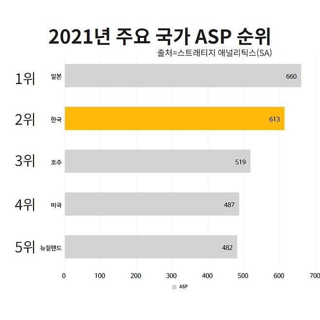 지난해 588달러(64만626원)보다 30달러 가량 더 오르며 SA가 ASP를 집계한 이래 처음으로 600달러를 돌파했다. 코로나19 확산에도 불구하고 큰 폭의 증가세다. 전 세계 88개국 평균 예상 ASP(272달러)보다 300달러 이상 높다.