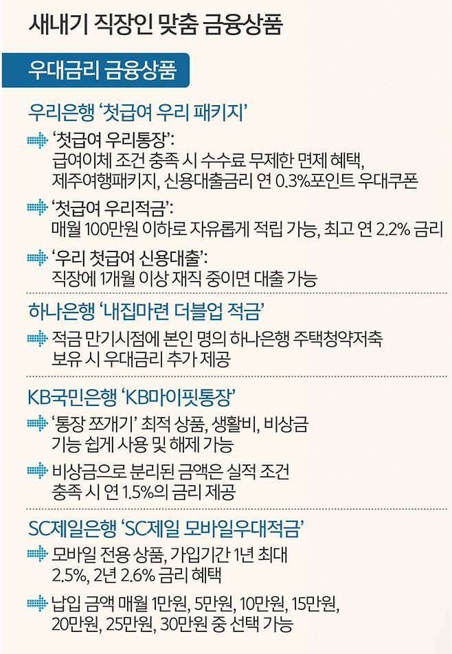 첫급여 우리통장은 급여이체 조건 충족 시 우리은행을 거래할 때 발생하는 전자금융 수수료뿐 아니라 다른 은행을 이용할 때 발생하는 자동화기기 출금 및 자동이체 수수료까지 무제한 면제 혜택을 제공한다. 또한, 부가서비스로 제주여행패키지와 신용대출금리 연 0.3%포인트 우대쿠폰을 제공한다. 첫급여 우리적금은 매월 100만원 이하로 자유롭게 적립 가능하며, 급여이체 우대조건만 충족하면 최고 연 2.2%(기본금리 1.1%, 우대금리 1.1%포인트) 금리를 제공한다. 우리 첫급여 신용대출은 현재 직장에 1개월 이상 재직 중인 고객이라면 누구나 대출이 가능하며, 급여이체조건만 충족하면 금리우대혜택도 받을 수 있다.