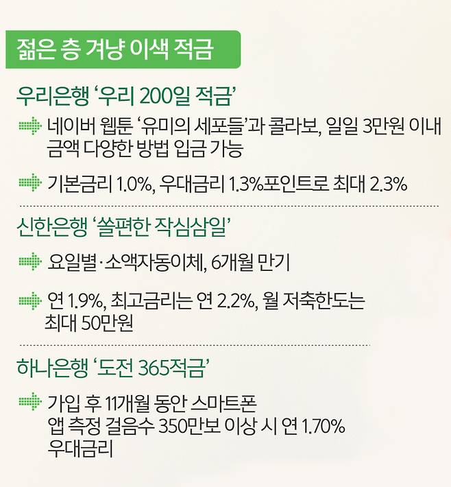 우리은행은 네이버에 연재 중인 인기 웹툰 ‘유미의 세포들’과 협업해 우리WON뱅킹에서 웹툰 방식의 새로운 인터페이스를 도입한 ‘우리 200일 적금’을 선보이고 있다. 일일 3만원 이내 금액으로 나에게 맞는 플랜을 정해 다양한 방법으로 입금할 수 있다. 적금 이율은 최대 2.3%로 기본금리 1.0%와 우대금리 1.3%포인트를 적용한다.